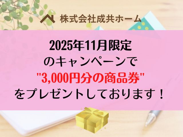 2025年11月限定でwebお問い合わせ頂いた方限定で3,000円分の商品券をご成約された方全員にプレゼントしております。