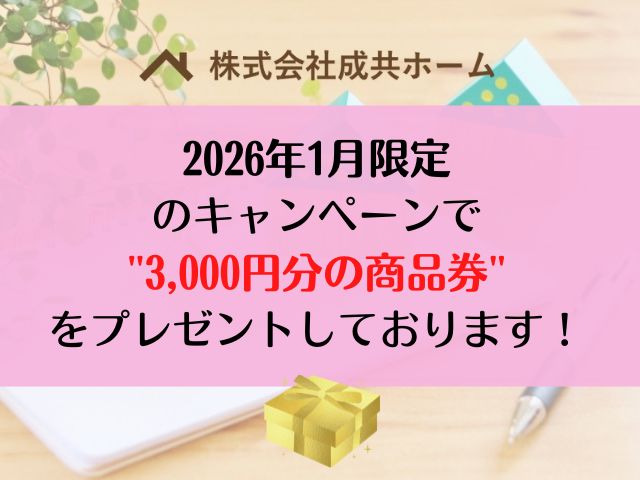 2026年1月限定でwebお問い合わせ頂いた方限定で3,000円分の商品券をご成約された方全員にプレゼントしております。